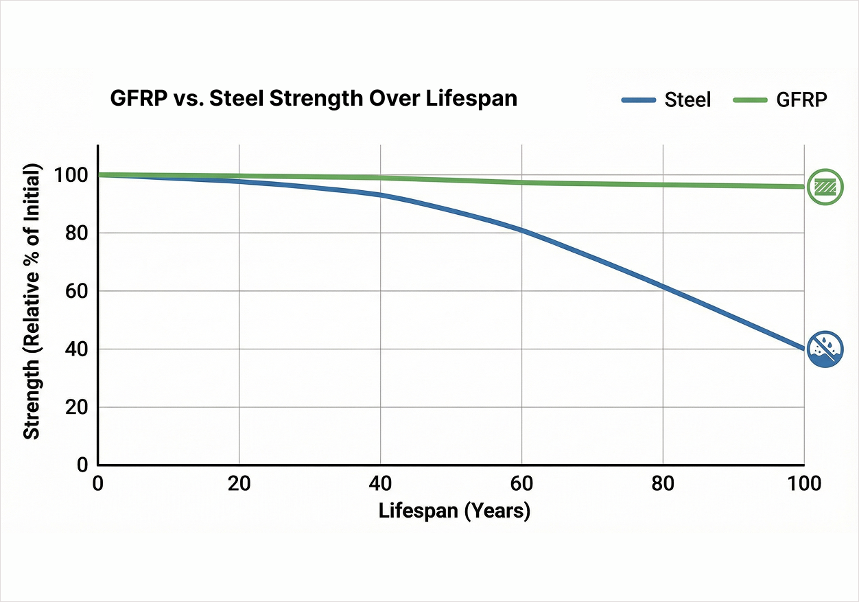 GFRP strength curve stays flat and stable for 100+ years.